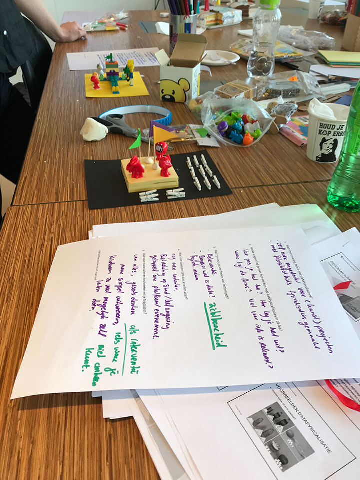 When looking at the expressed questions and goals, one of the biggest challenge is to make dataphys relevant and purposeful. Although it is hard to quantify, the short physicalisation exercise in which the people involved reflected and discussed their artefacts each afterwards, turned out to be a rather unexpected easy, fun and valuable way to support and enrich common thinking and discussion. The physical results show that writing, making and discussing dataphys are different vehicles for expression and vehicles that can complement each other.