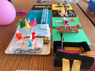 Extra material: Skewers, little umbrellas, ribbons, cake candles (zero and one shaped), pop-out city (Studio roof), cardboard easels, fabric sticker sheet, little bricks, figurines, Rainbow loomkit (rubber band craft) and leftovers from laser cutting.