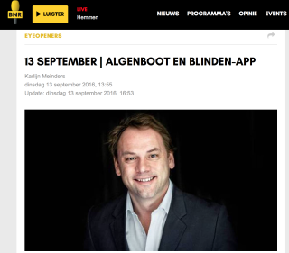 Studenten die voor de zomer de minor Intelligent Environments volgden, waren dinsdag 13 september te gast bij BNR nieuwsradio. HBO-ICT student Jordy Matsari en CMD-studente Britte Visser spraken met reporter Meinders Schut van het programma BNR Eye openers over hun onderzoeksproject. Dit project ging over het ontwikkelen van een digitale geleidelijn voor blinden en slechtzienden mbv. (i)beacon technologie, en werd in opdracht van Koninklijke Visio, experticecentrum voor mensen met een visuele beperking, uitgevoerd onder begeleiding van Digital Life onderzoeker Joey van der Bie.